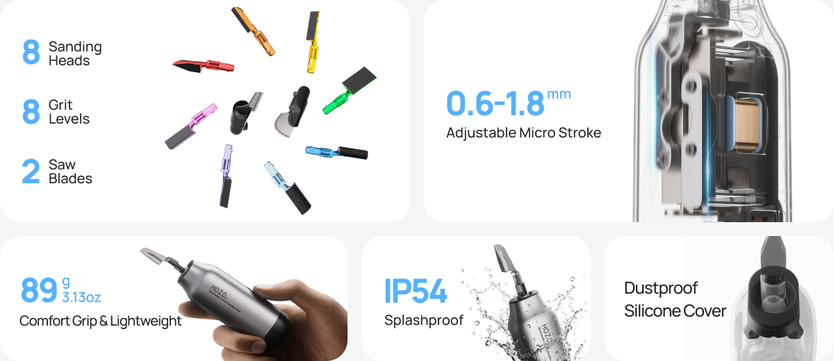 All accessories—including sandpaper refills, sanding heads, saw blades, and storage racks—are available on our official website at hozodesign.com.