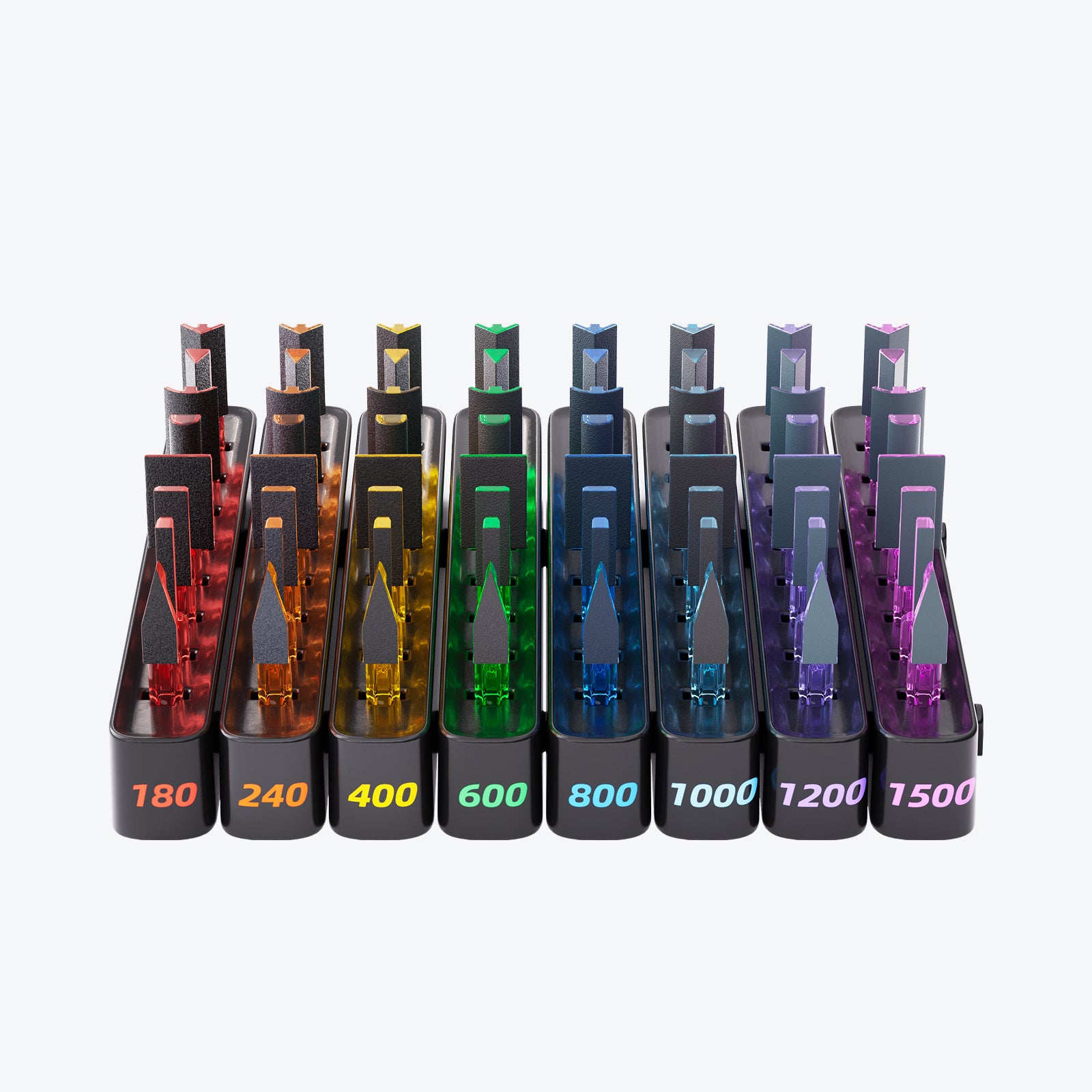 With this setup, your grits always stay sorted and ready to swap. From coarse to fine, just grab the head you need, snap it on, and keep sanding.